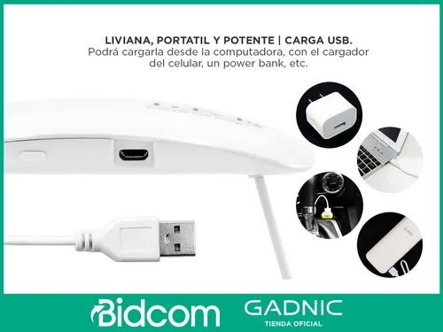 – Carga USB: se puede alimentar desde la computadora, desde el cargador del celular, desde un power bank.