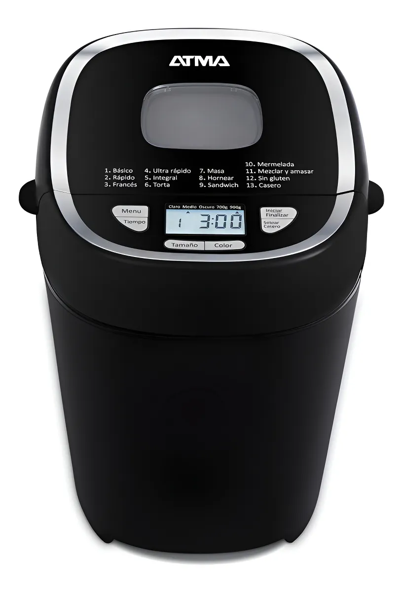 ¡Transformá tu cocina con el Horno de Pan ATMA Negro! Este horno te permite sorprender a todos con pan recién horneado en casa. Con una capacidad de 900 gramos, podés preparar desde un esponjoso pan blanco hasta un integral saludable, gracias a sus 13 programas automáticos. La pantalla digital y las luces indicadoras te hacen la vida más fácil, mientras que el temporizador y la señal sonora te avisan cuando está todo listo.