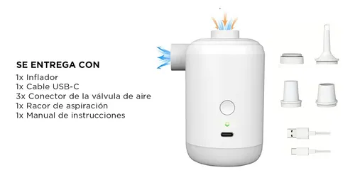 Boquillas Intercambiables: Con boquillas intercambiables incluidas, puedes adaptar el inflador a diferentes tipos de válvulas, asegurando una conexión segura y eficiente con una variedad de artículos inflables.