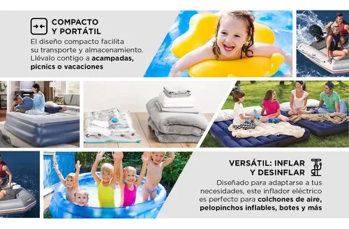 Versatilidad de Uso: Diseñado para adaptarse a tus necesidades, este inflador eléctrico es perfecto para colchones de aire, pelopinchos inflables, botes y más. Su versatilidad lo convierte en un compañero confiable tanto en casa como en tus aventuras al aire libre.
