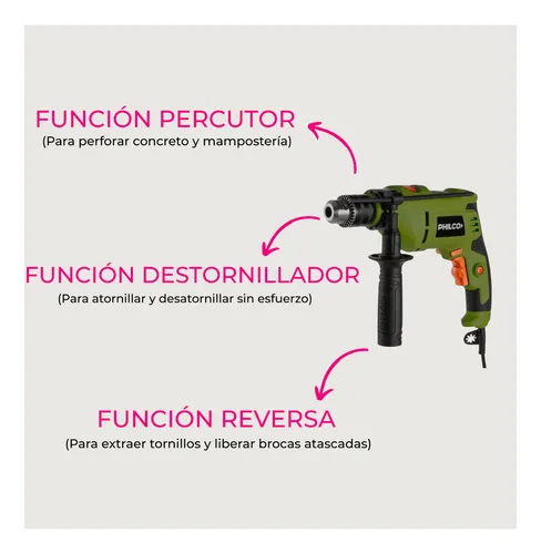 El Taladro percutor atornillador eléctrico de 13mm Philco TP711 es la herramienta perfecta para tus proyectos de bricolaje y trabajos profesionales en Argentina. Con una potencia de 710W, este taladro te permite realizar perforaciones y atornillados con facilidad y rapidez. Su mandril de 13mm garantiza un agarre seguro de las brocas y puntas, mientras que su velocidad variable de hasta 3000 rpm te brinda el control necesario para adaptarse a diferentes materiales y tareas. Además, cuenta con función percutor, ideal para perforar en concreto y mampostería, y función destornillador, que te permite atornillar y desatornillar sin esfuerzo. La función reversa facilita la extracción de tornillos y la liberación de brocas atascadas. No pierdas la oportunidad de tener esta herramienta versátil y potente en tu hogar o taller. ¡Adquiere el Taladro percutor atornillador eléctrico Philco TP711 y lleva tus proyectos al siguiente nivel!