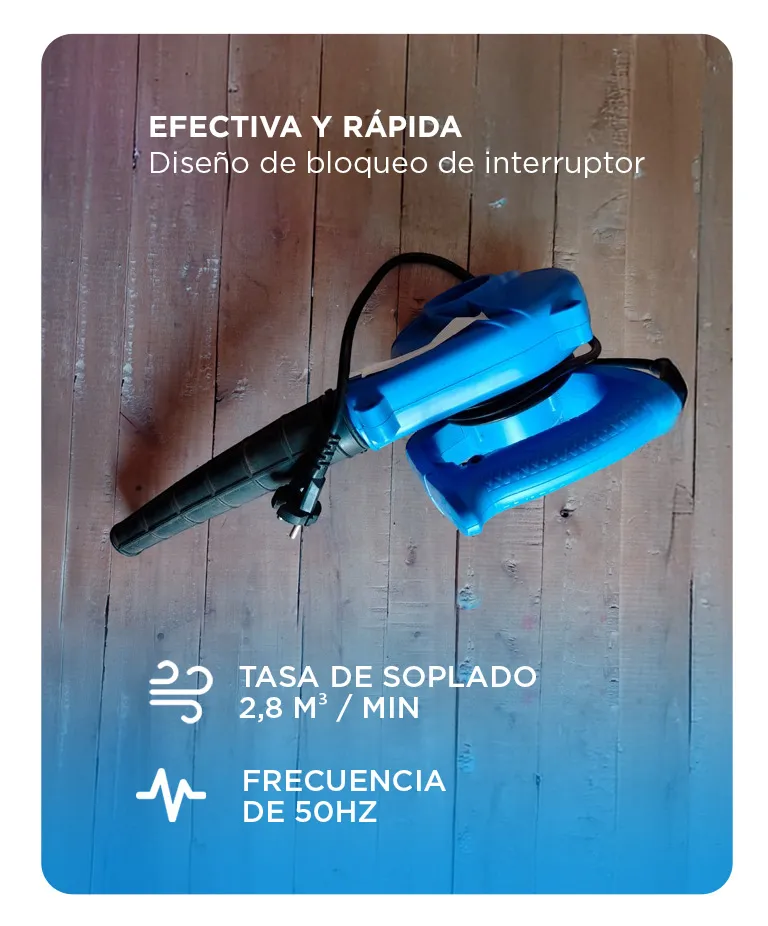La sopladora ofrece un flujo de aire de 2,8 m³/min, ideal para despejar hojas y polvo de jardines, patios, garajes o talleres.